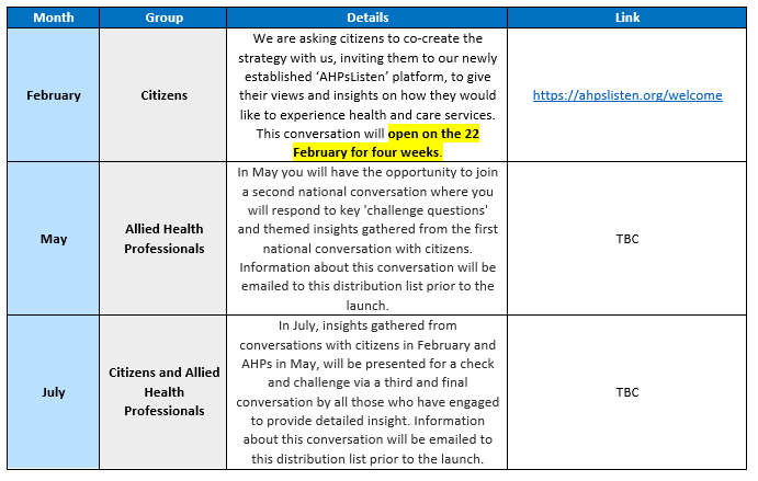 The first group ‘citizen’s’ can register now to have there say at the AHPListens website please share this link amongst colleagues, patients, family and friends.