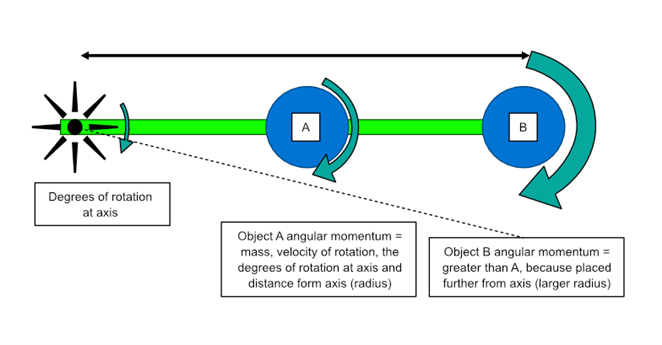 In angular momentum, the distance the object is from the axis of rotation is just as important as the size of mass and the velocity. The further from the axis that the mass is, the greater the force required to start or stop it moving as demonstrated in Fig. 2.