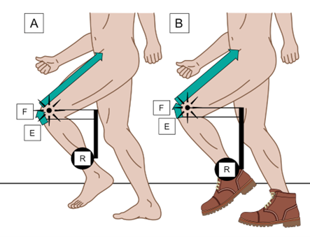 Figure 3. During late swing phase (A) the quadriceps muscles provide effort force (E) at the tibial tuberosity, creating extension moments across the knee. The knee is acting as an axis or fulcrum (F) to move the resistance (R) of the lower leg mass around. The placement of mass within a limb matters, as it affects the position of the CoM being moved during locomotion. Adding heavy boots (B) increases stresses on the quadriceps and patellar ligament during swing phase as a result of larger moments being generated on a larger, more distantly placed resistance. (Permission www.healthystep.co.uk).