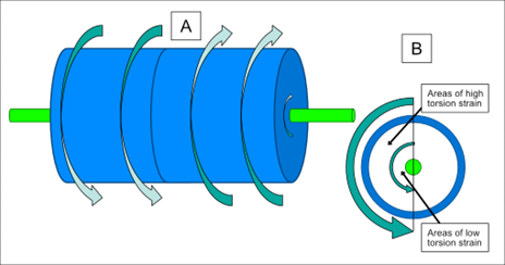 Figure 4. Torsion is a particularly destructive force in biology. It occurs when part of the anatomy rotates in the opposite direction or at a faster rate to the rest of it (A). Tissue further from the axis of torque is under the most stress (B). Such concepts help explain why long bones are able to be almost hollow in the middle but require thick cortical shafts. (Permission www.healthystep.co.uk)