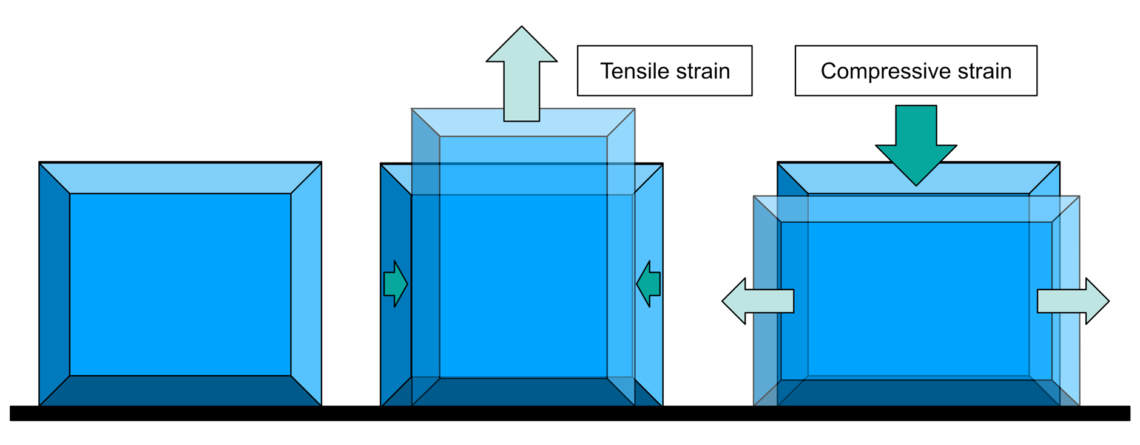 Strain is the proportional change in a material’s dimensions under stress, and again it is positive under tension and negative in compression. This is also a vector because, without direction, we cannot know what is occurring within the material. Under Newtonian mechanics, we expect a material to become longer and narrower under longitudinal tension and wider but shorter under compression, in proportion to the amount of stress. Strain is dependent on the direction of stress and where it is applied, as shown in Fig. 7. However, biological materials express non-Newtonian and non-Hookean properties. Thus, under different amounts and directions of strains, differing loading rates, and quantities of loading cycles, the body’s tissues express dimensional changes differently (Horwood and Chockalingam, 2023b pp.120-123).