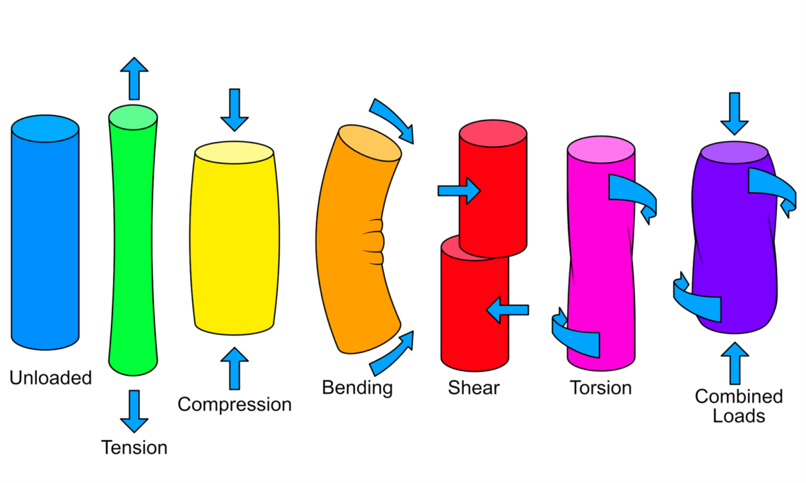 Figure 7. The direction of stress and the resultant strain relate directly to each other, creating a number of types of deformation patterns. These are predictable in most non-organic materials. However, biological tissues are structured in ways to behave variability under different stresses. Most biological structures load with stress in a multitude of directions, but one stress/strain tends to dominate in any given location. Shear and torsion should always be minimised, because they are the most damaging to tissues. (Permission www.healthystep.co.uk)