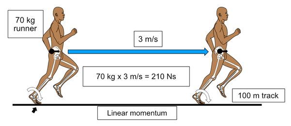 There are two types of momentum: linear and angular. Linear momentum expresses events of an object moving from one location to another in a straight line, such as when considering a whole human moving over a 100m sprint. See Fig. 1.
