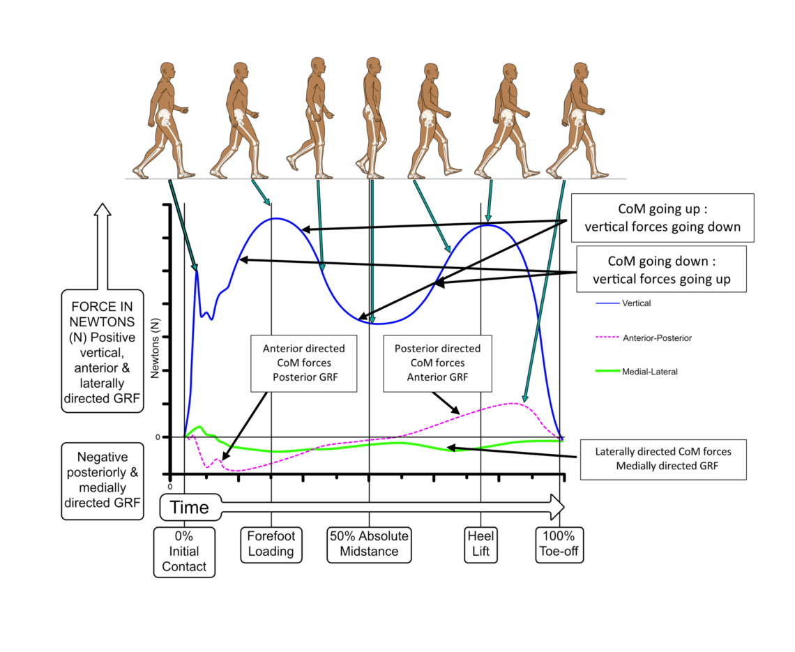 Figure 5. Forces become visible during gait through recording the changes in the ground reaction forces via a force plate. Changes in these forces over time are known as impulses. These impulses are a result of the motions of the body’s CoM and changes in limb positions. (Permission www.healthystep.co.uk)