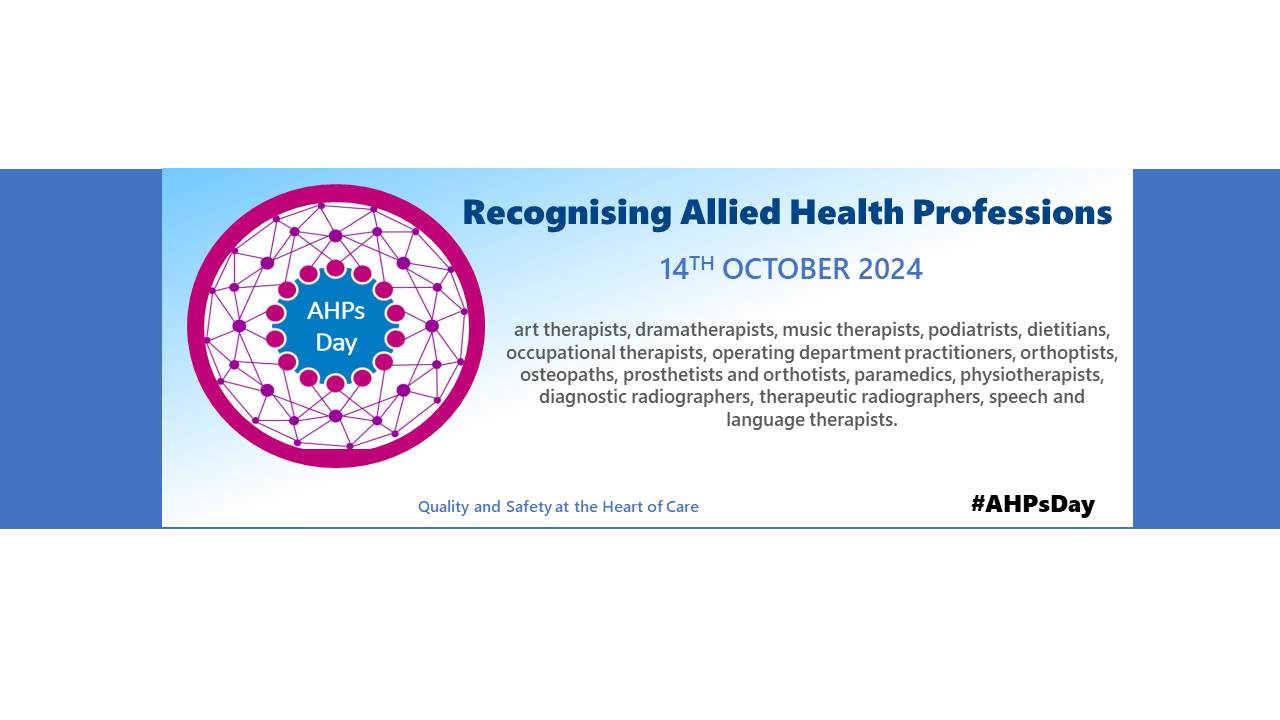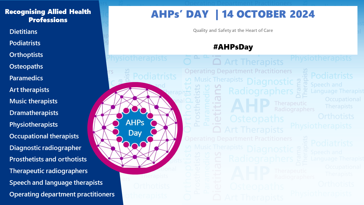 As developed by the #AHPCommunity itself, allied health professions (AHPs) day across England on October 14, 2024, is when AHPs/AHP teams connect and celebrate AHPs. We encourage you to celebrate on the day itself and/or throughout the week.