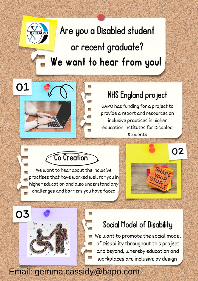 As part of the NHS England project that is researching inclusive design in higher education for Disabled learners, BAPO is running some listening sessions and wants to hear from students and graduates to understand the barriers and enablers in their higher education and placement experience. See the poster and link below for more details or email gemma.cassidy@bapowp.axia.support