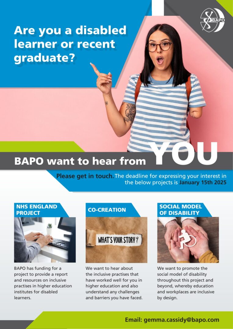 As part of the NHS England project that is researching inclusive design in higher education for Disabled learners, BAPO is running some listening sessions and wants to hear from students and graduates to understand the barriers and enablers in their higher education and placement experience. See the poster and link below for more details or email gemma.cassidy@bapowp.axia.support