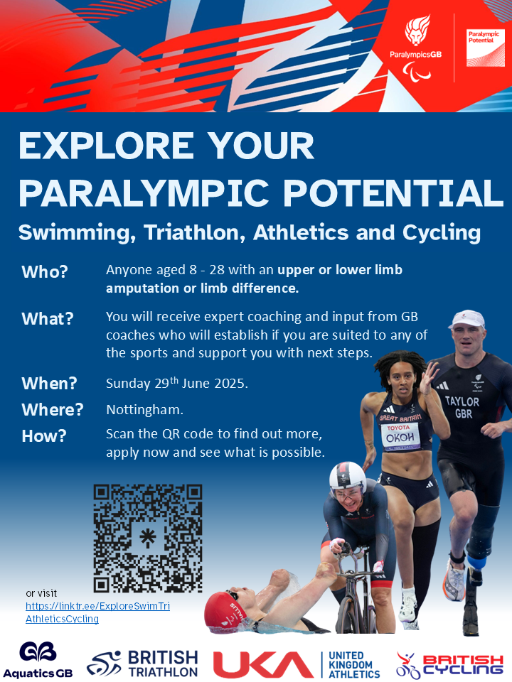 Are you or your child aged 8 – 28 with an upper or lower limb amputation or limb difference? Then the Explore Your Paralympic Potential – Swimming, Triathlon, Athletics and Cycling Event is for you! The Explore Event will take place on Sunday 29th June near Nottingham.