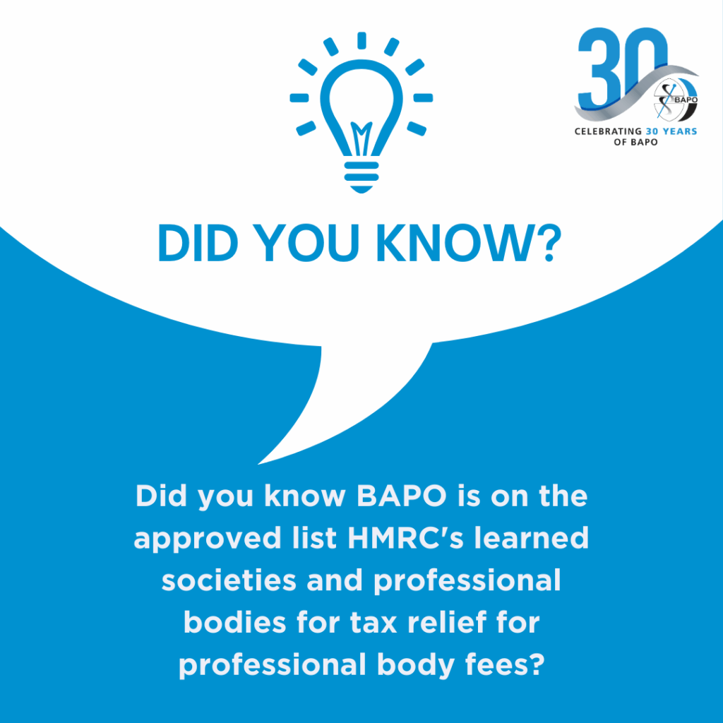 Did you know BAPO is on the approved list HMRC’s learned societies and professional bodies for tax relief for professional body fees. To see if you’re eligible for tax relief on your BAPO membership fees please visit: https://www.gov.uk/government/publications/professional-bodies-approved-for-tax-relief-list-3