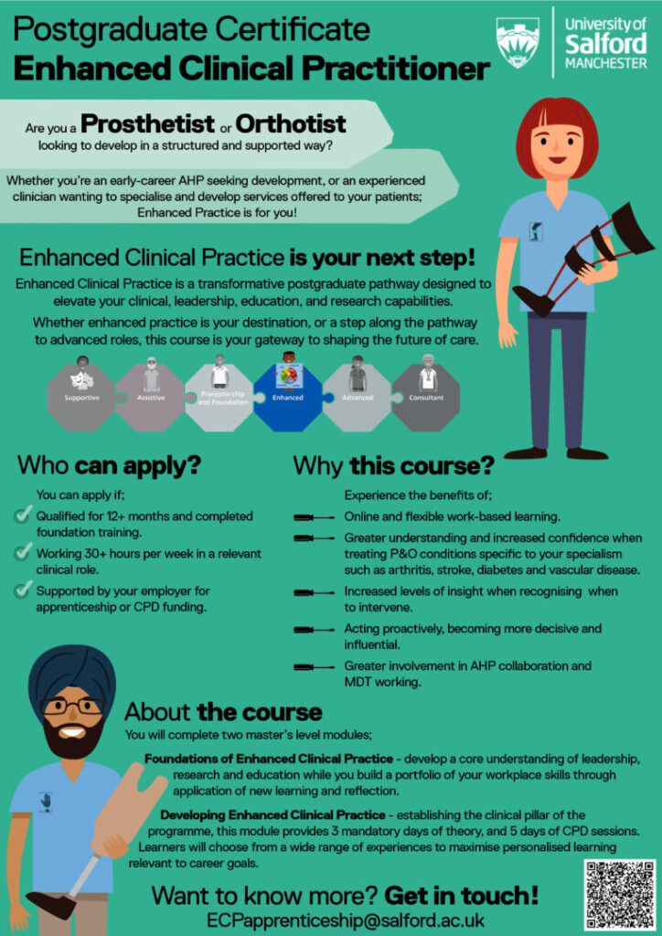 This innovative PgCert supports Prosthetists and Orthotists to progress to Enhanced level practice through a flexible and personalised work-based learning model. Grounded in the four pillars of practice (clinical, leadership, education, and research), the programme enables apprentices to tailor learning to their specific role and service context.