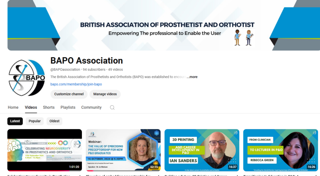 The BAPO YouTube channels contains a range of video resources spanning subject areas such as BAPO Learning, dementia awareness, interviews with members of the P&O workforce, and BAPO event highlights.